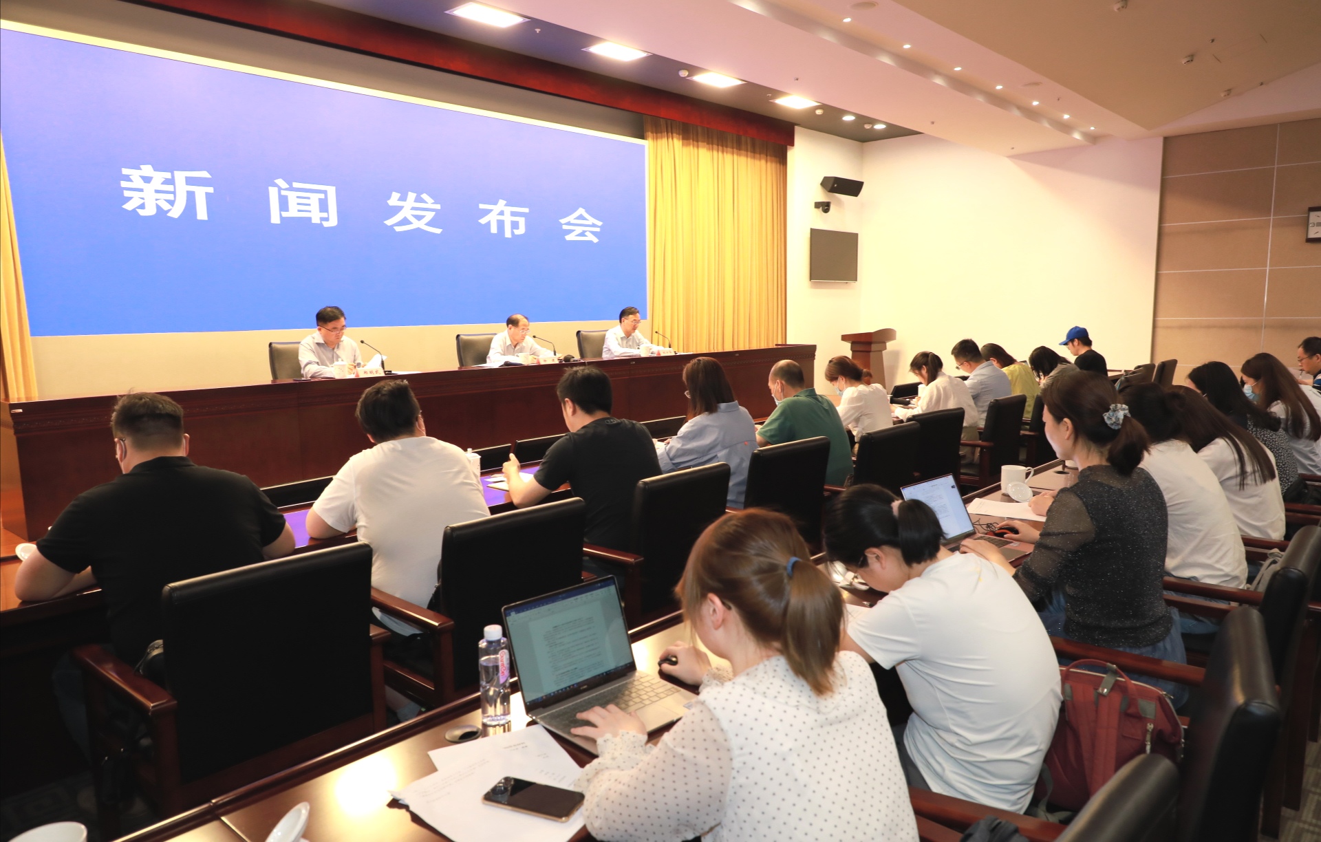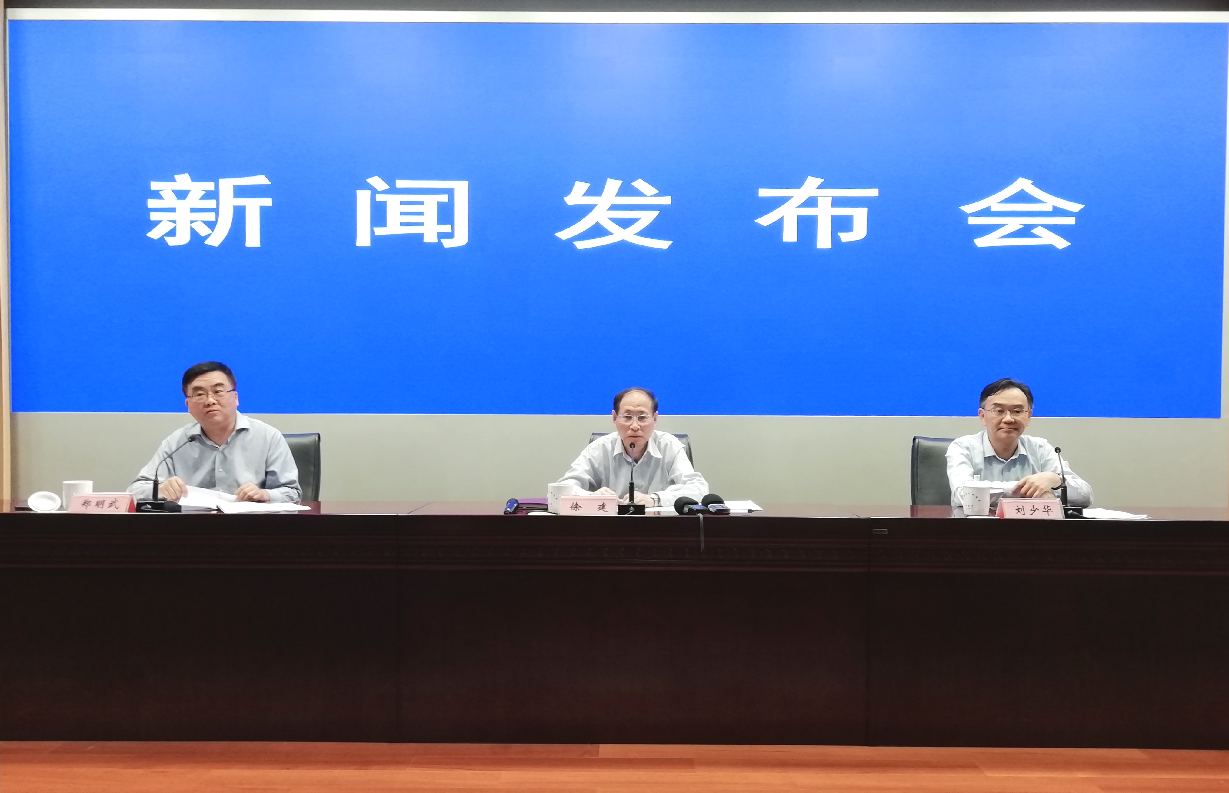 安徽省貫徹落實中央「六穩」「六保」部署要求系列新聞發佈會現場(第三場),左起:安徽省委宣傳部副部長、省政府新聞辦主任鄭明武主持發佈會,省人力資源社會保障廳廳長長徐建,副廳長劉少華介紹相關情況並回答記者提問(孫軍/攝)