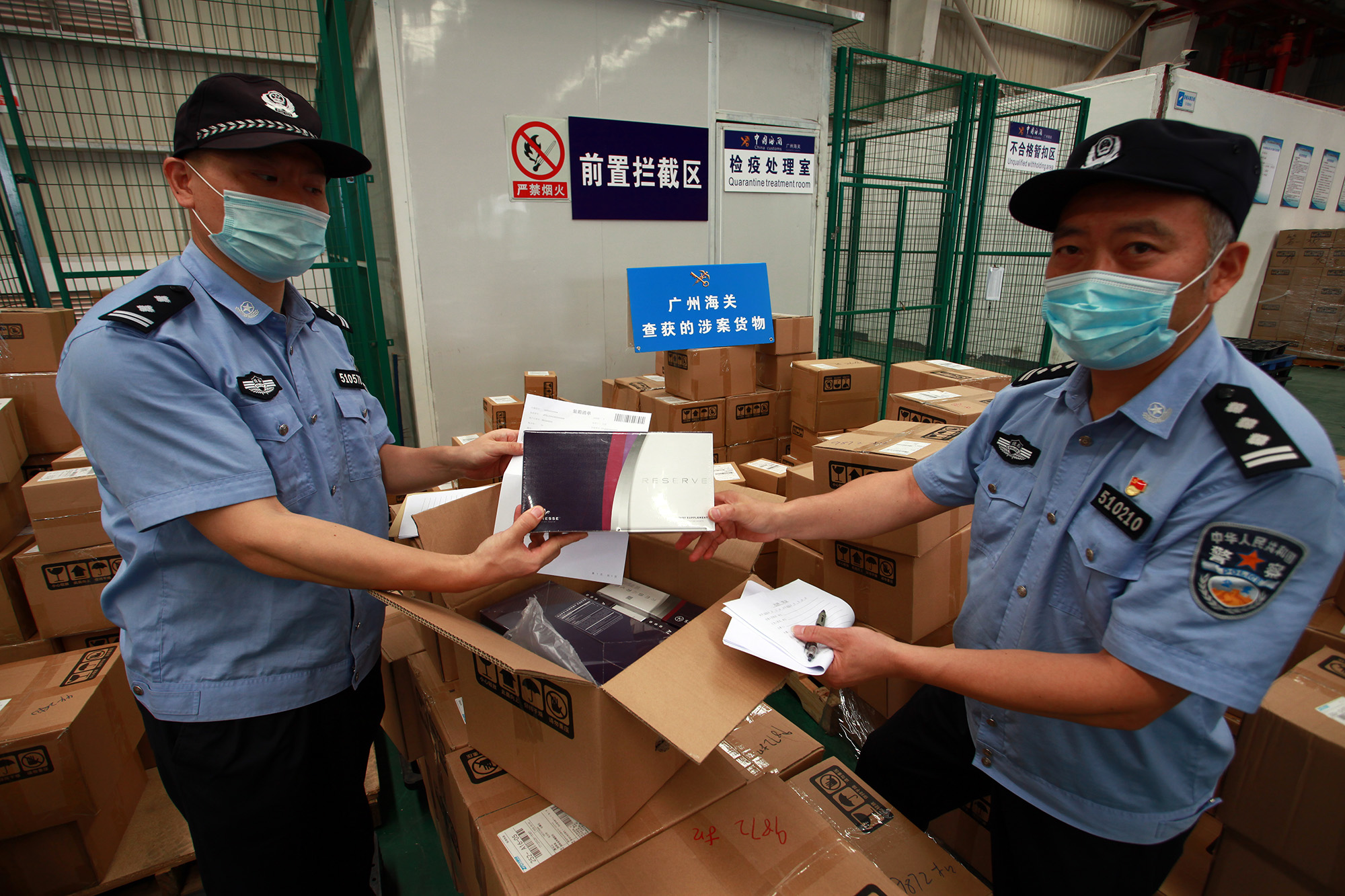 缉私警察检查涉案货物(黄汉宏摄)