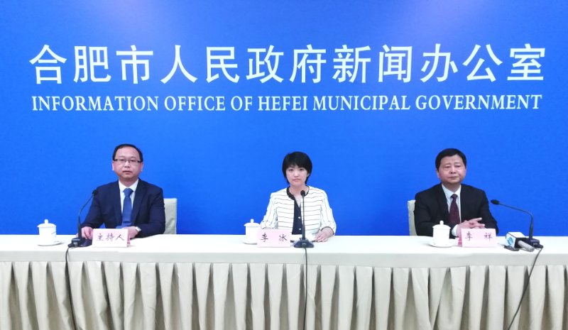 「真抓實幹 創先爭優——國務院督查激勵專項工作巡禮」專題宣傳系列發佈會(第六場)現場。左起:合肥市人民政府新聞辦公室主任王立群主持發佈會,合肥市自然資源和規劃局黨組成員、副局長李冰,蜀山區副區長李祥先後介紹相關情況(孫軍/攝)