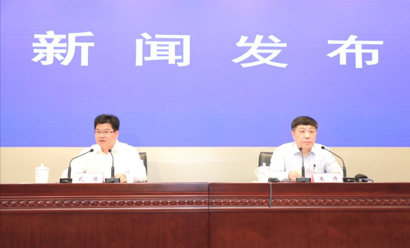 安徽省貫徹落實中央「六穩」「六保」部署要求系列新聞發佈會現場(第四場),安徽省委宣傳部新聞發佈處處長武瀟(左)主持發佈會,省商務廳副廳長朱丹介紹相關情況並回答記者提問(孫軍/攝)