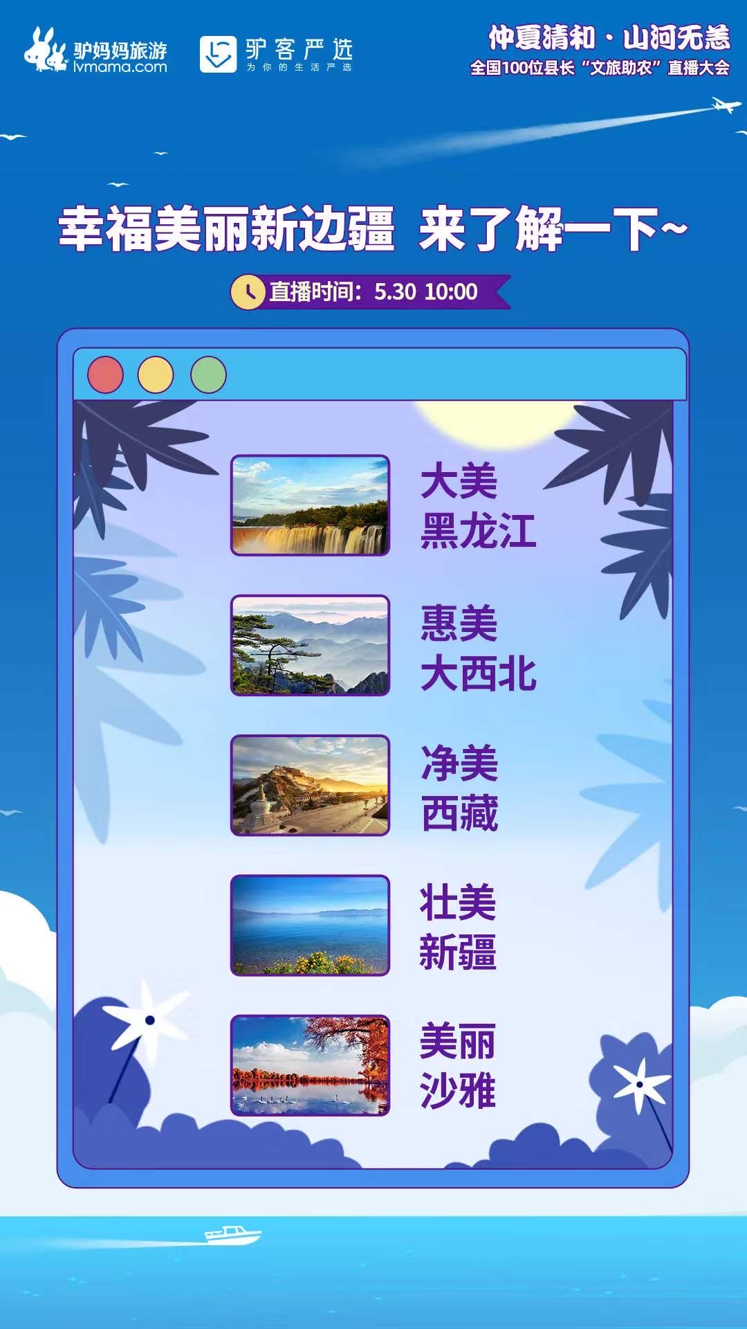 【香港商報網訊】「要多措並舉擴消費,適應群眾多元化需求。」「電商網購、在線服務等新業態在抗疫中發揮了重要作用;全面推進『互聯網+』,打造數字經濟新優勢。」5月30日,由中國旅遊研究院、上海市工商聯指導,黑龍江省文化和旅遊廳、黑龍江省供銷合作社聯合社、新疆維吾爾自治區旅遊產業發展領導小組、景域驢媽媽集團承辦,新疆維吾爾自治區旅遊協會等支持,黑龍江、陝西、西藏、新疆、內蒙古、吉林等省地縣、區參與的「仲夏清和·山河無恙」系列公益活動之5.30「全國100位縣長『文旅助農』直播大會」將隆重舉行。