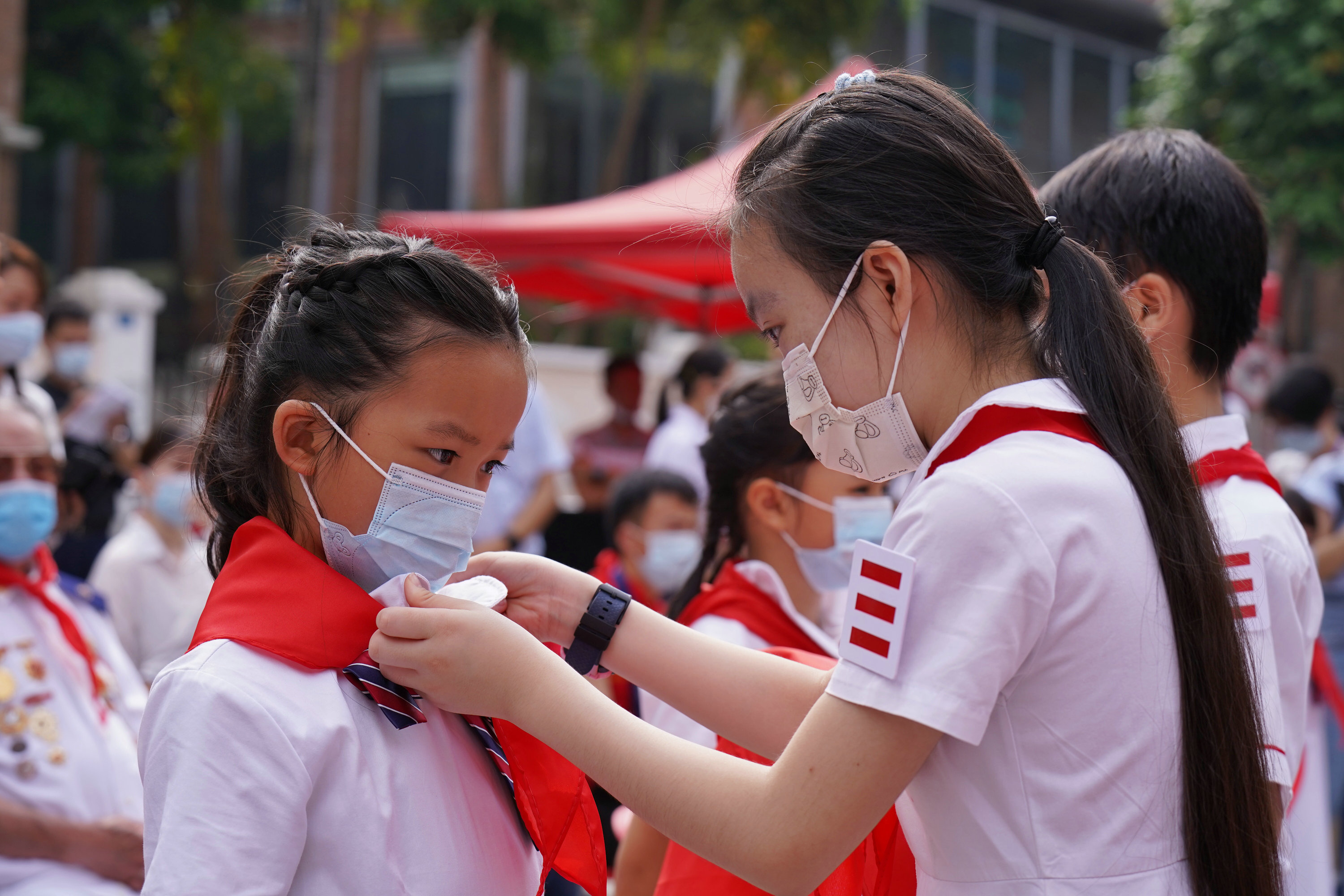 今天的儀式,除了邀請廣州市屬學校和11個區的新入隊隊員代表來到現場,參加集體入隊儀式,還邀請革命英雄、抗疫先鋒、扶貧先鋒、優秀團員等5位先鋒人物來到活動現場,為新隊員們佩戴紅領巾,發出寄語,儀式後還跟隊員們分享了他們的先鋒模範故事。