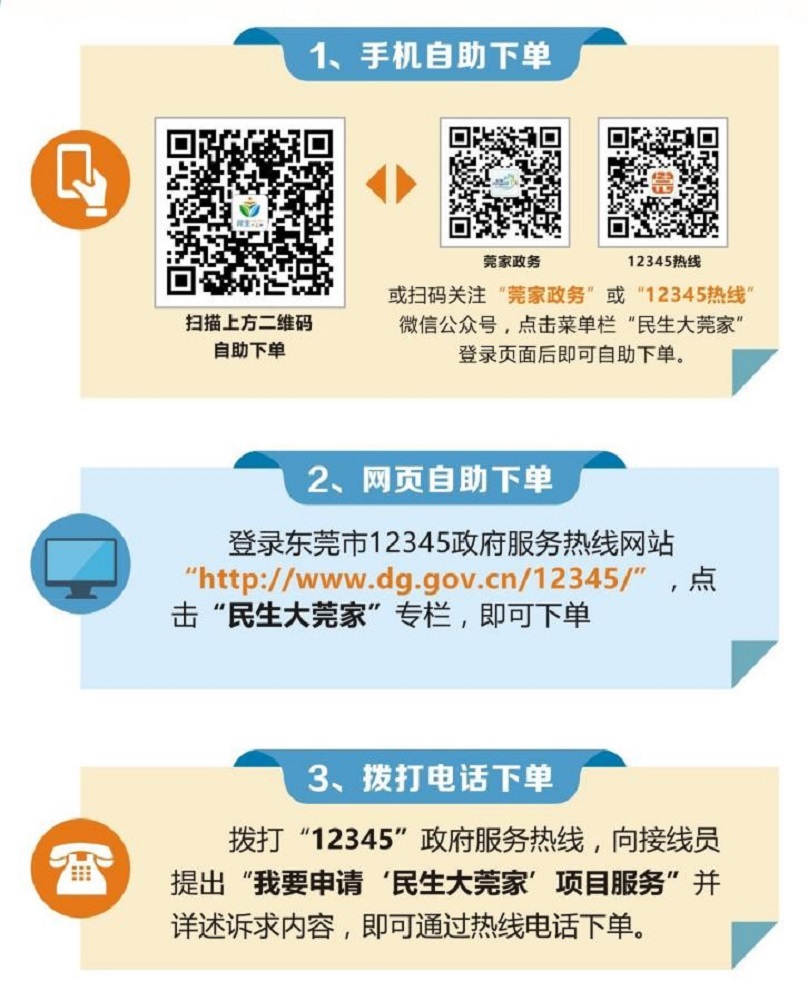 確有上述項目需求的民眾,可通過手機自助下單、網頁自助下單、撥打電話、實體窗口下單等多種方式提出自己的訴求。如果民眾提出的訴求可通過現有政策和渠道解決的,就通過現有政策解決。現有政策不能解決的,可通過「莞家速遞」、「莞家直達」、「莞家驛站」等方式予以快速辦理,切實解決民眾身邊小急難問題,夯實築牢民生兜底保障基礎。
