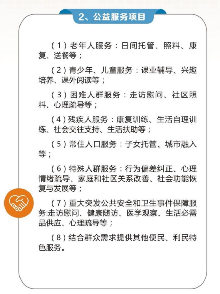 據介紹,「民生大莞家」項目主要包含以滿足公眾利益訴求為目標的「民生微實事」與以滿足個人、家庭利益訴求為目標的「民生微心愿」兩類項目。其中,「民生微實事」項目包含路面修復、房屋維修、小公園路面修復、房屋維修、小公園修建美化等修建美化等便民工程類項目和為老人、青少年、困難群眾、殘疾人、常住人口等不同群體提供的8類公益服務項目。