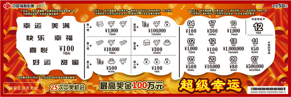 據悉,「超級幸運」票面整體以黃金閃閃的100萬元獎金數字作為主圖與玩法刮開區,整體感極強,刺激而又醒目;配色採用了最受彩民歡迎的紅色與黃色,背景裝飾有鞭炮、金幣;「超級幸運」遊戲為多玩法組合,趣味性強;三個玩法均很簡單直觀,帶給彩民以超值之感。