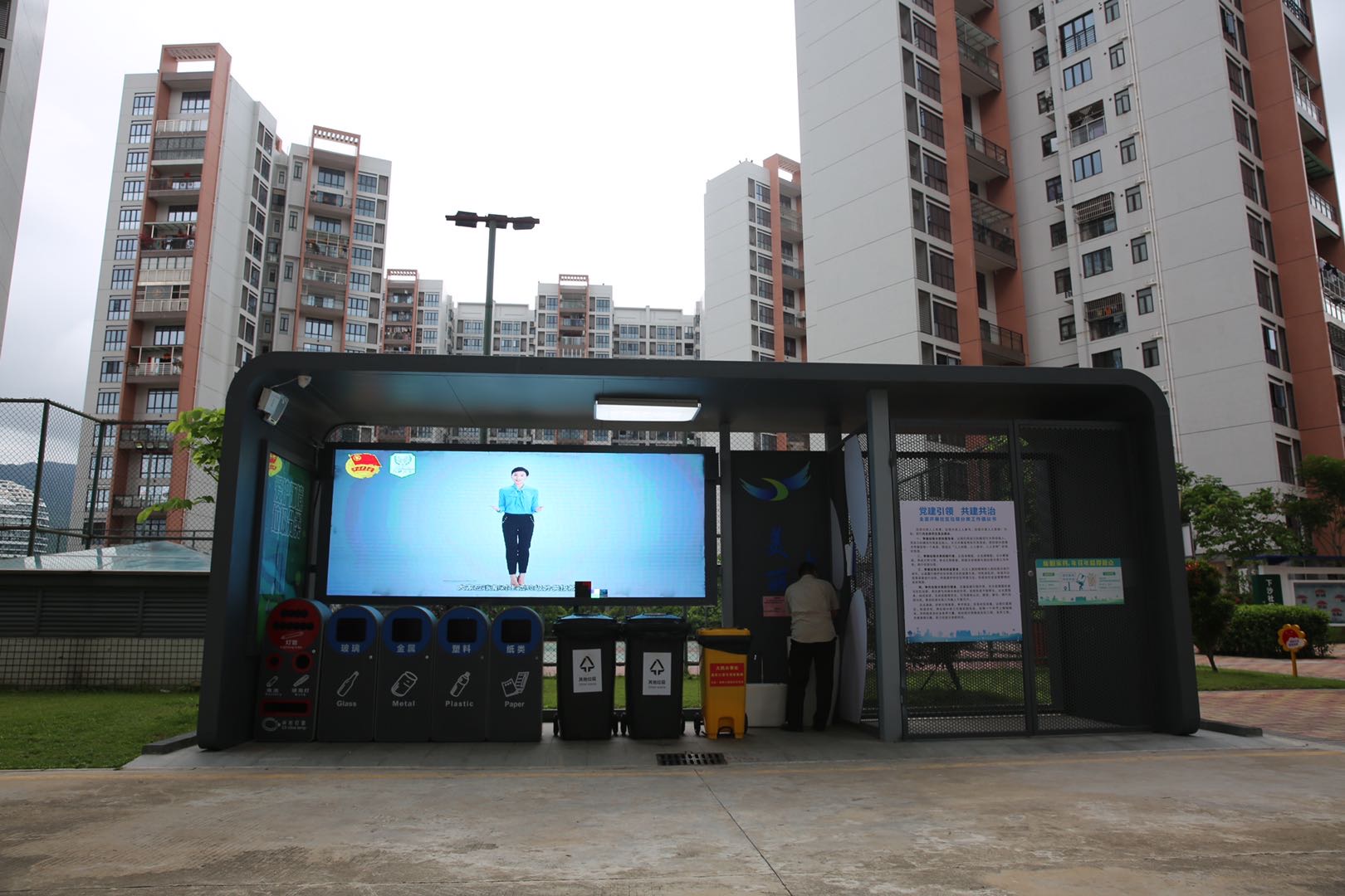 記者注意到,已建成的高標點,包含亭台、四分類垃圾桶、大件垃圾回收間、洗手盆、洗桶池以及背景廣告燈箱、照明、監控、對講系統等設施。尤其值得一提的是,下沙社區建成了功能更為齊全的高標準垃圾分類投放點,設置了LED顯示屏、高清監控和對講系統,定時播放垃圾分類宣傳片,實現了手機、終端實時投放大屏幕,並可通過監控室實時監測與居民對話,引導居民朋友正確分類投放垃圾,積極營造主動參與生活垃圾分類和減量的社會氛圍。