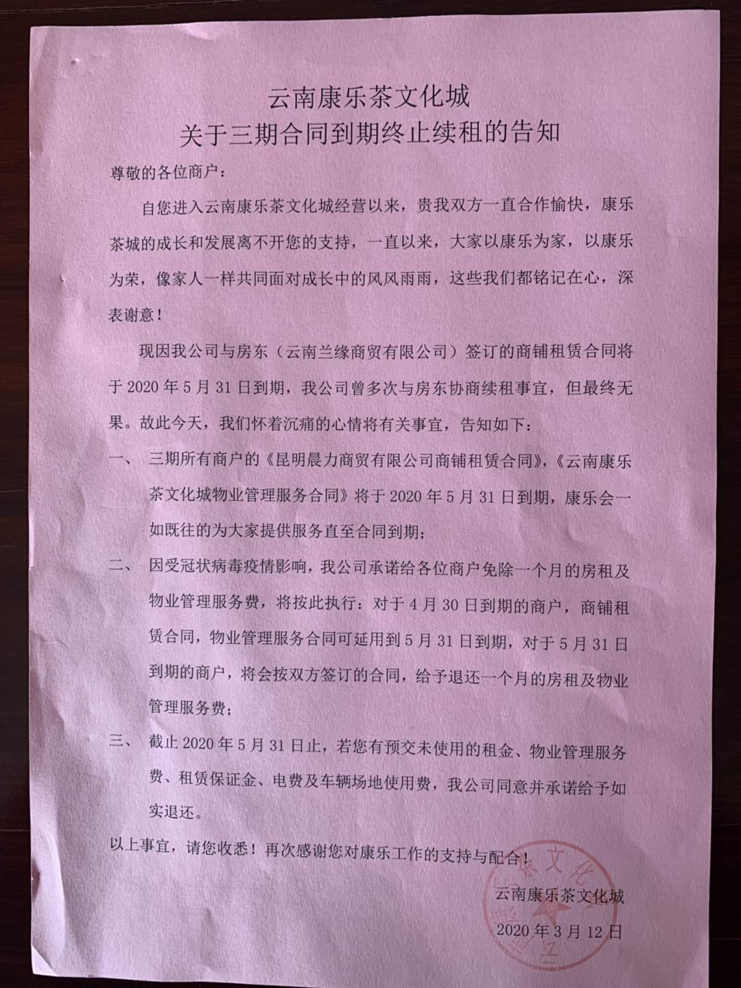隨後,記者前往雲南康樂茶文化城找到陳傑副總經理,他介紹,茶城於2004年建設至今已16年的歷史,三期是因為蘭緣的傢具城經營不善在2008年的時候主動與我們聯繫溝通,擴建茶城三期,由蘭緣按茶城風格建設,由我們管理,當初簽訂了12年的合同。從招商到市場都逐漸成熟,如今合同到期蘭緣不願意繼續合作,我們與他們進行了N次溝通,但無奈對方提出的條件極為苛刻,如繼續合作將簽訂4年的合同,並且以2年為期限,每2年上漲15%的租金,經過公司的測算,這將屬於虧損狀態,對於我們來說這條件接受不了,無奈只能放棄。在3月12日的時候給三期商戶發了合同期終止的告知書,並且在5月31日合同期滿時和商戶做了清算,其中包括疫情期間承諾的減租一個月也給商戶全部退回。