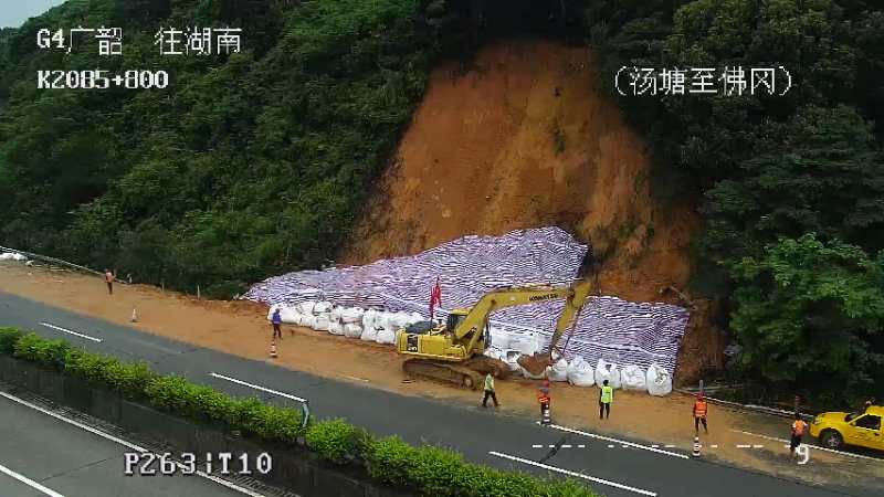 廣韶高速往廣州方向K2085(佛岡站至湯塘站)發生山體滑坡,滑坡的泥土、樹木佔據第二、三車道、緊急停車帶,現場保留一條車道通行;目前交警、路政、養護正在現場處理。