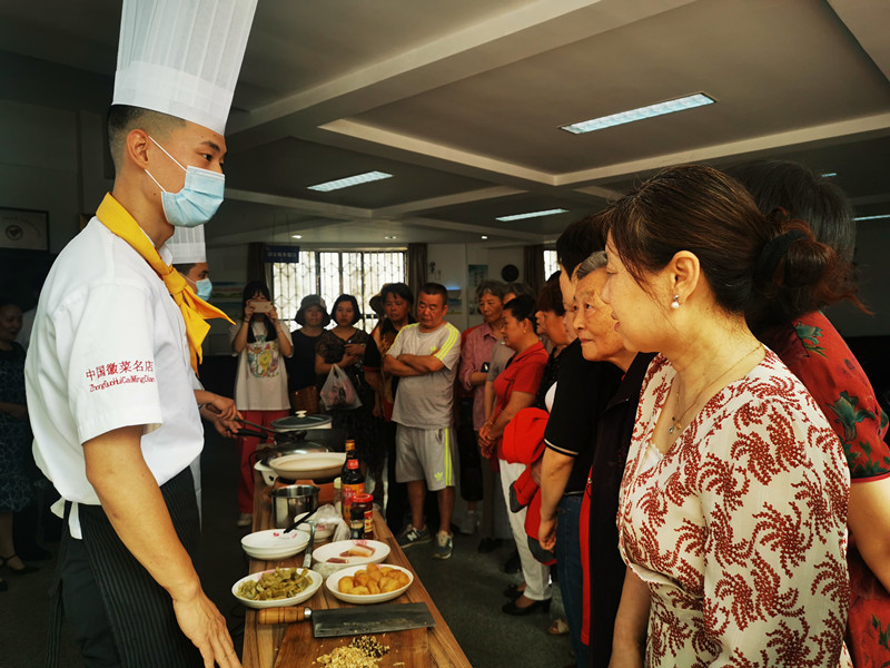 6月5日,记者在昱東街道水心亭社區看到,社區大廳內,來自“樂分享”講師團的大廚們,正在和居民們分享做菜的經驗和技巧。