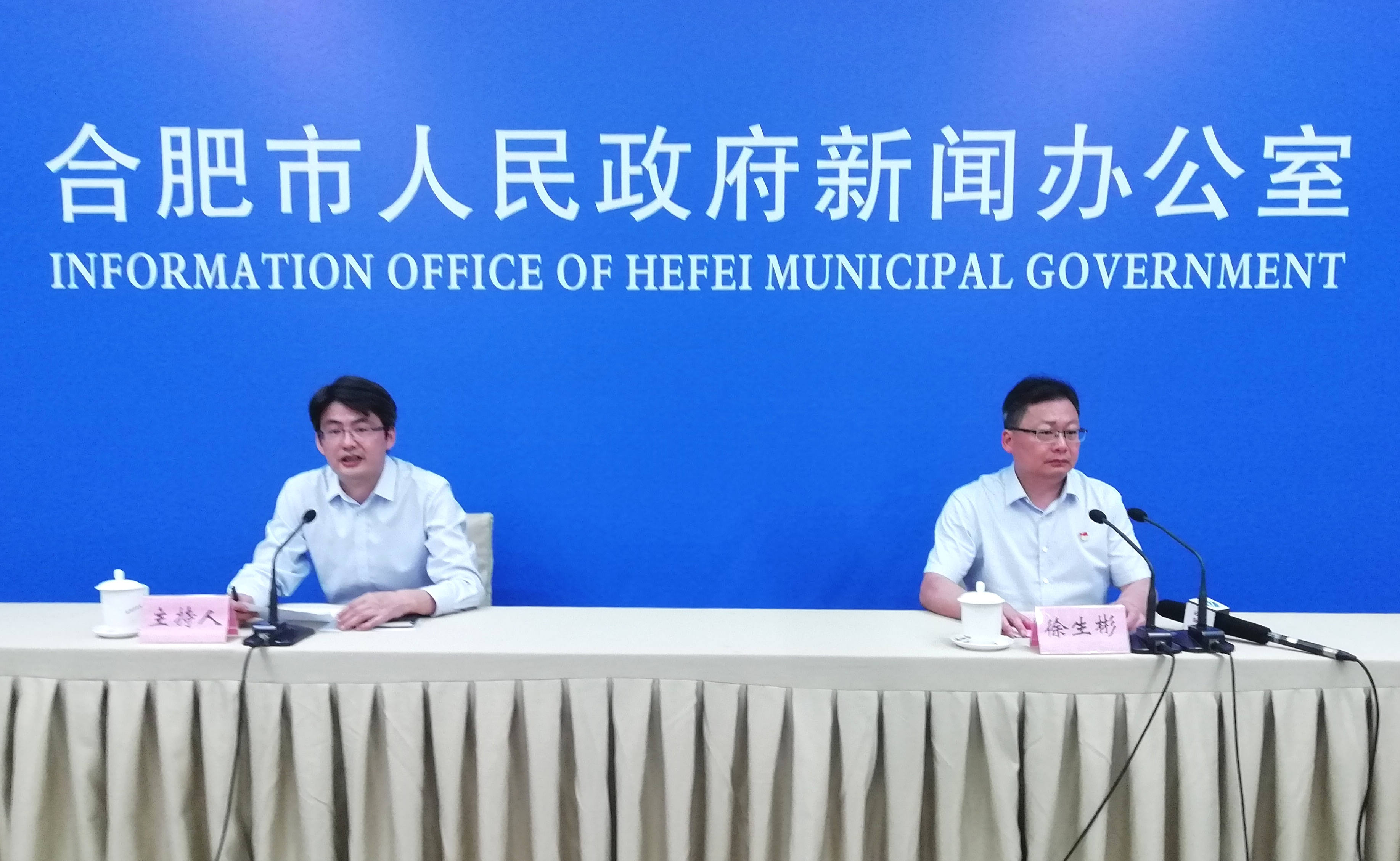 「走進產業園區 探尋產業地標」合肥系列新聞發佈會現場(第三場),合肥市委宣傳部外宣辦主任趙明錄(左)主持發佈會,合肥市包河區委副書記、合肥包河經濟開發區負責人徐生彬介紹相關情況(孫軍/攝)