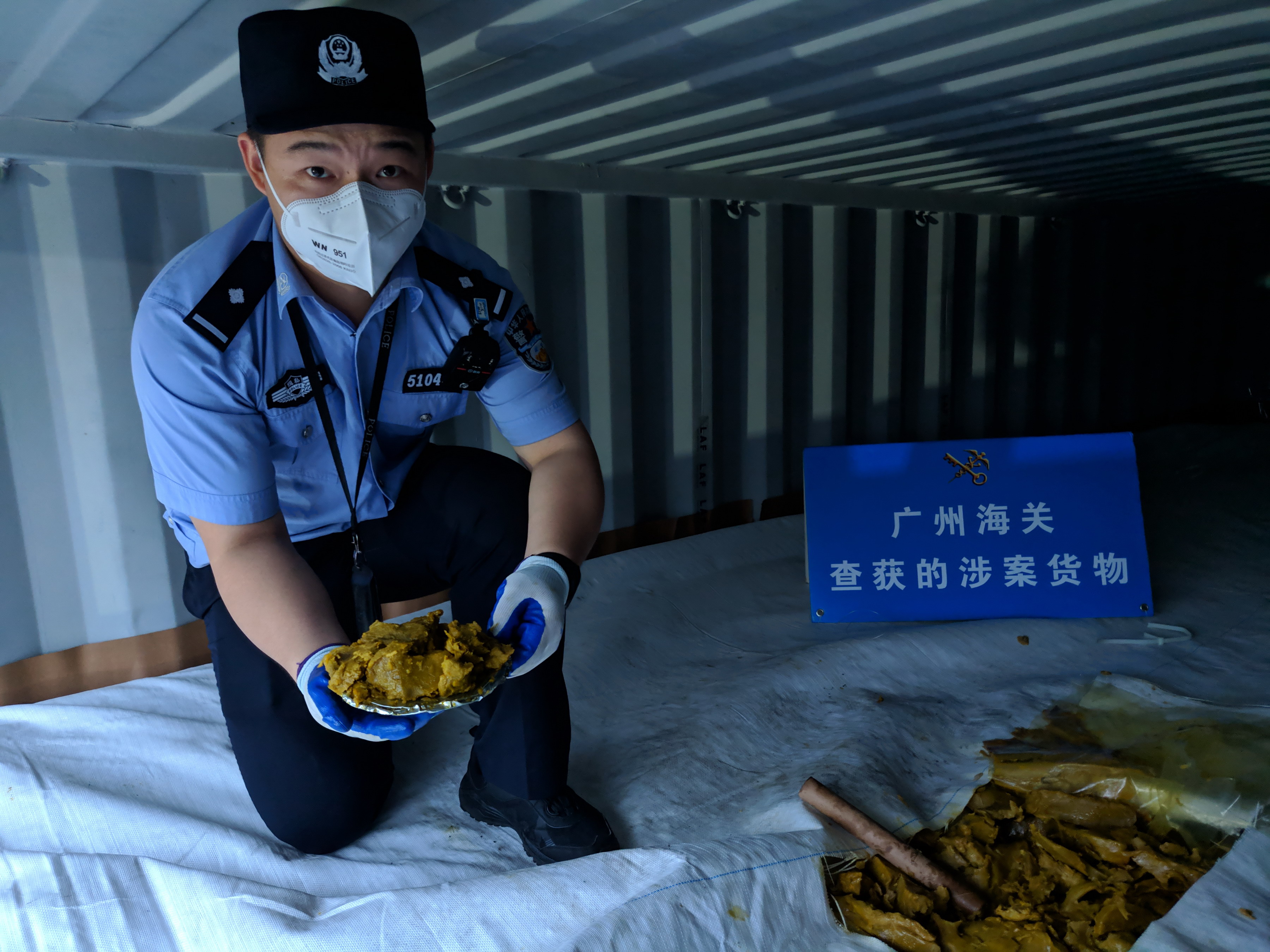 廣州海關緝私警察在檢查查獲的走私進境固體廢物
