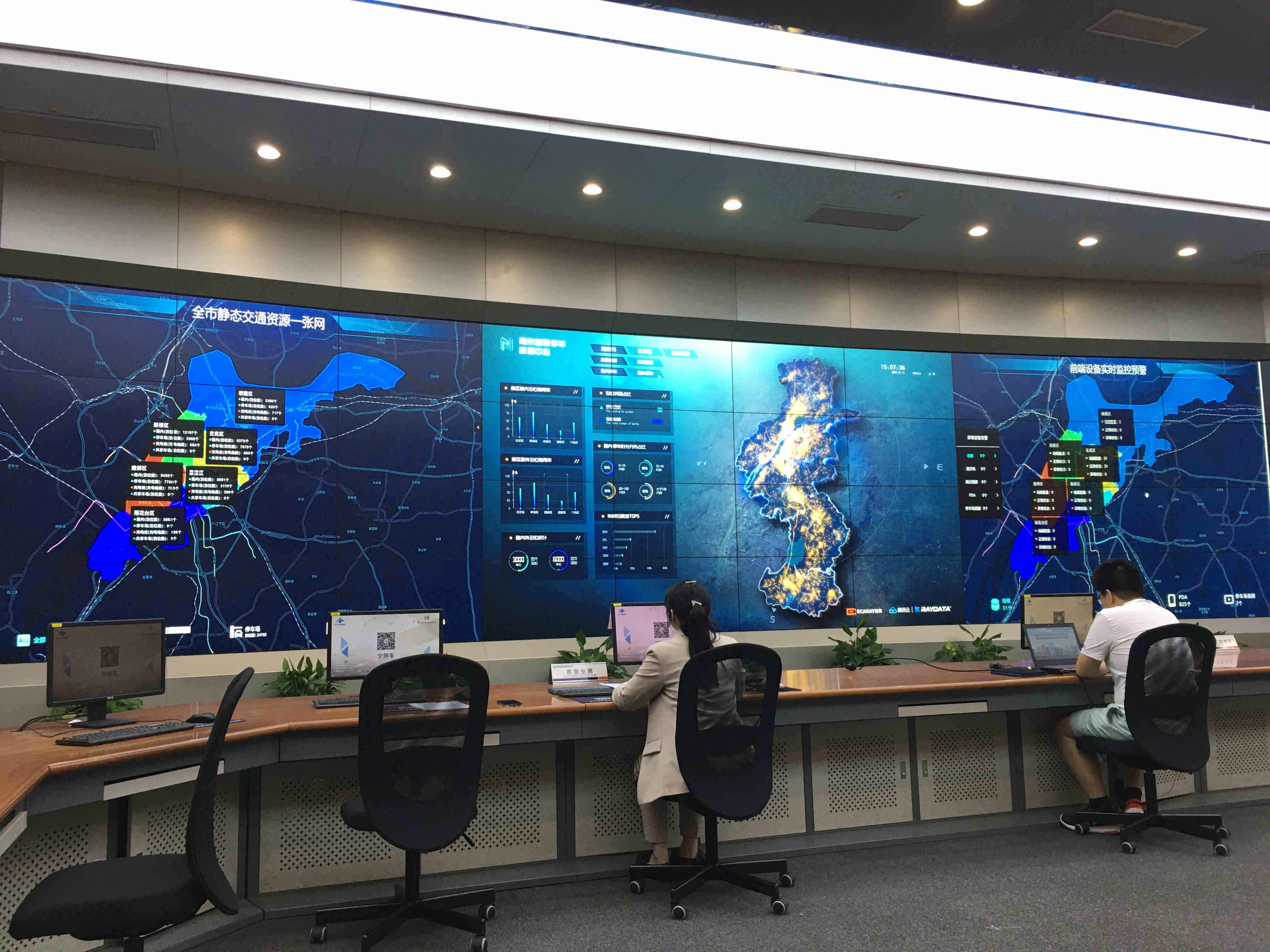 南京智慧停車數據中心內,全市主城區4萬多個泊位情況實時顯示,一目了然