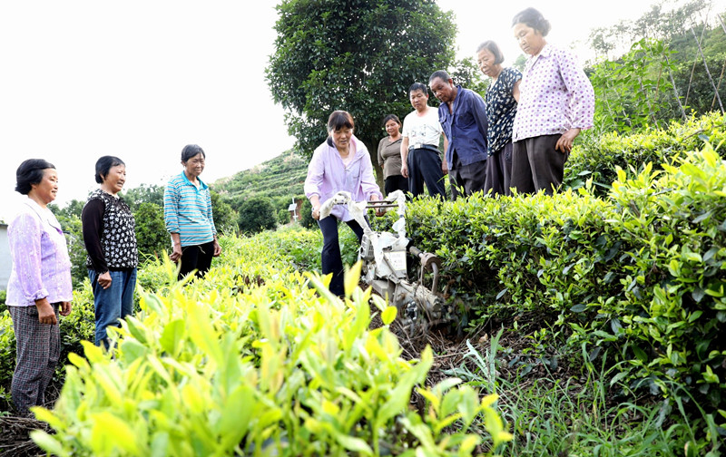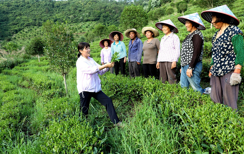 【香港商報網訊】6月16日,安徽黄山市歙縣富堨鎮青山村“黃山甘白香白茶生態園”負責人曹月紅(左一)給村民講解白茶夏季管理注意事項。