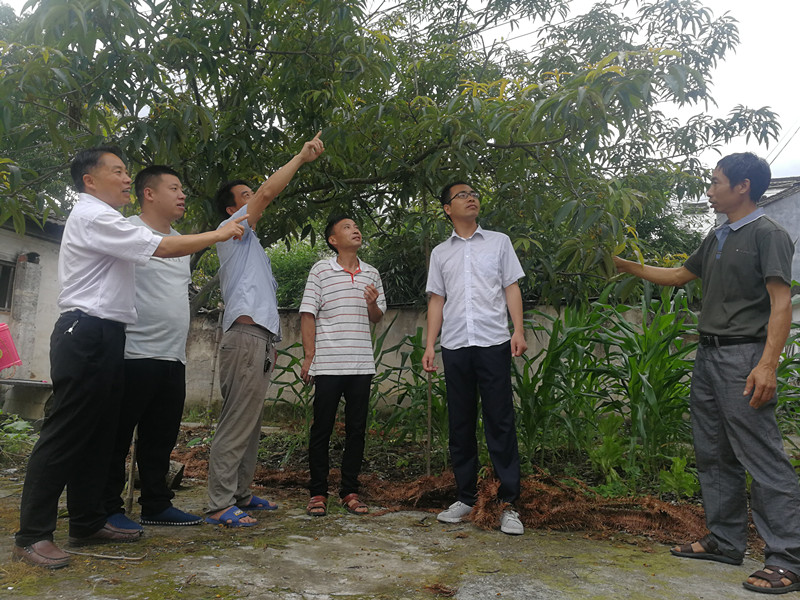 查坑村駐村扶貧工作隊和新型主體幫扶典型洪炳紅(左三)查看今年山核桃長勢