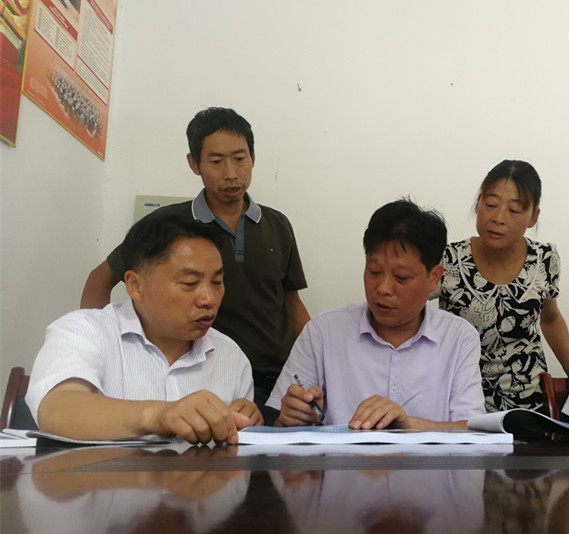 駐村扶貧工作隊隊長陳翰武(左)和鄉村幹部一道,討論美麗鄉村省級中心村建設規劃