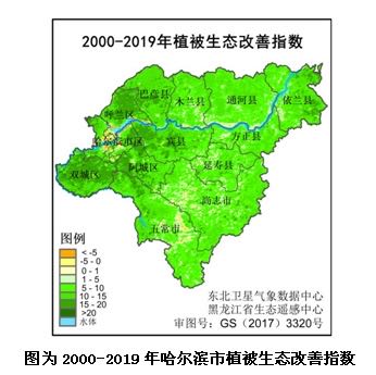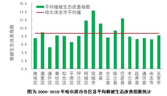 近20年哈爾濱市植被生態質量呈現整體改善的趨勢,改善的區域佔全市面積的97.1%,特別是哈爾濱市東、西部農區植被生態質量改善最為明顯,雙城、巴彥、阿城、賓縣和依蘭等地改善指數均高於全市平均值,其中雙城改善效果最為突出;主城區因城市化進程,導致局部植被生態質量局部轉差,但整體依然呈明顯的正增長,充分體現了哈爾濱市城市綠化建設成效顯著。