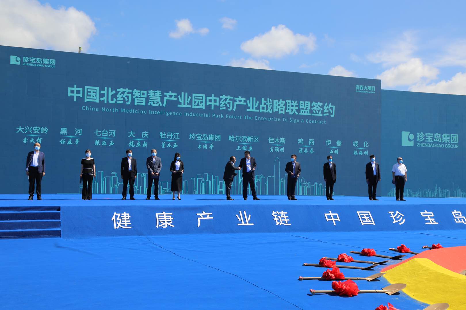 在奠基儀式上,中國北葯智慧產業園與首批入駐的10家企業簽約;哈爾濱新區與珍寶島集團,及牡丹江、佳木斯、大慶等9個地市簽署中藥產業戰略聯盟。