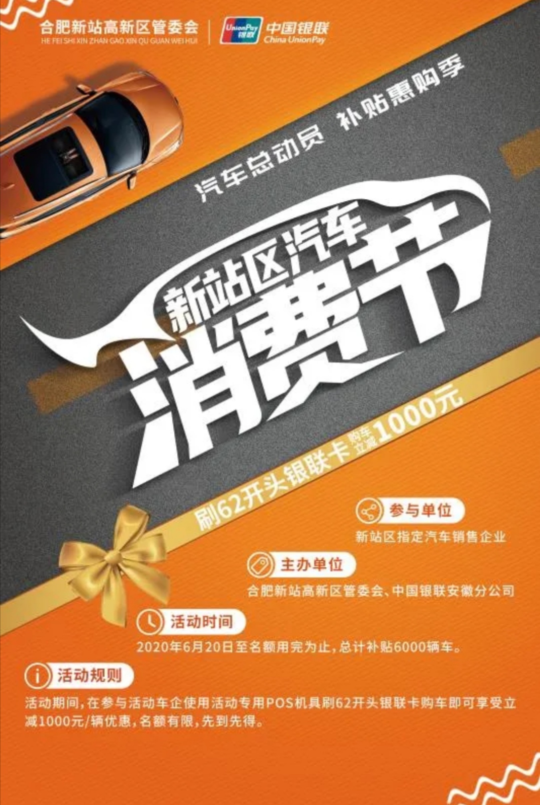 另外,6月20日-12月31日,合肥新站高新區將發放汽車消費券,每台汽車補貼1000元。補貼總金額600萬元,補貼總數量6000輛,補貼名額用完即活動結束。