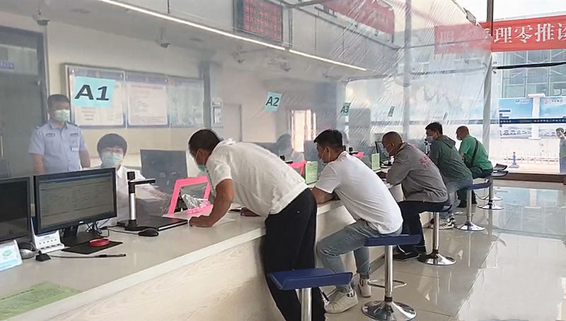 由於是疫情期間,所有車主都要先進行網絡預約,進入交易大廳前還要進行掃碼、測溫和消毒。繳納車輛購置稅、錄入系統、選號……在交易大廳內,每項工作都在有條不紊地進行着。車主們都自覺地拉開安全距離,迅速辦理、迅速離開。牌照發放點也是同樣的情況。車主們只需等待5分鐘左右就能拿到「新鮮出爐」的號牌。