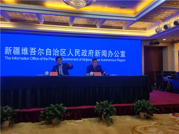 發佈會現場。自治區人社廳黨組成員、副廳長、新聞發言人劉俊昌(右);自治區新聞辦對外聯絡處處長李潔(左)