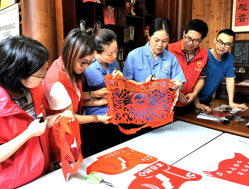 6月24日,安徽黄山市歙縣自然資源和規劃局黨支部開展以“不忘初心,牢記使命”為主題的慶祝建黨99周年剪紙創作活動,徽州剪紙非遺傳承人吳笑梅(中)在指導黨員志願者創作獻禮作品。