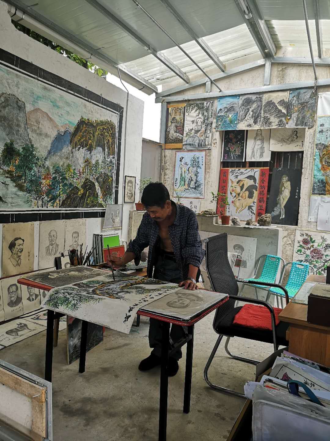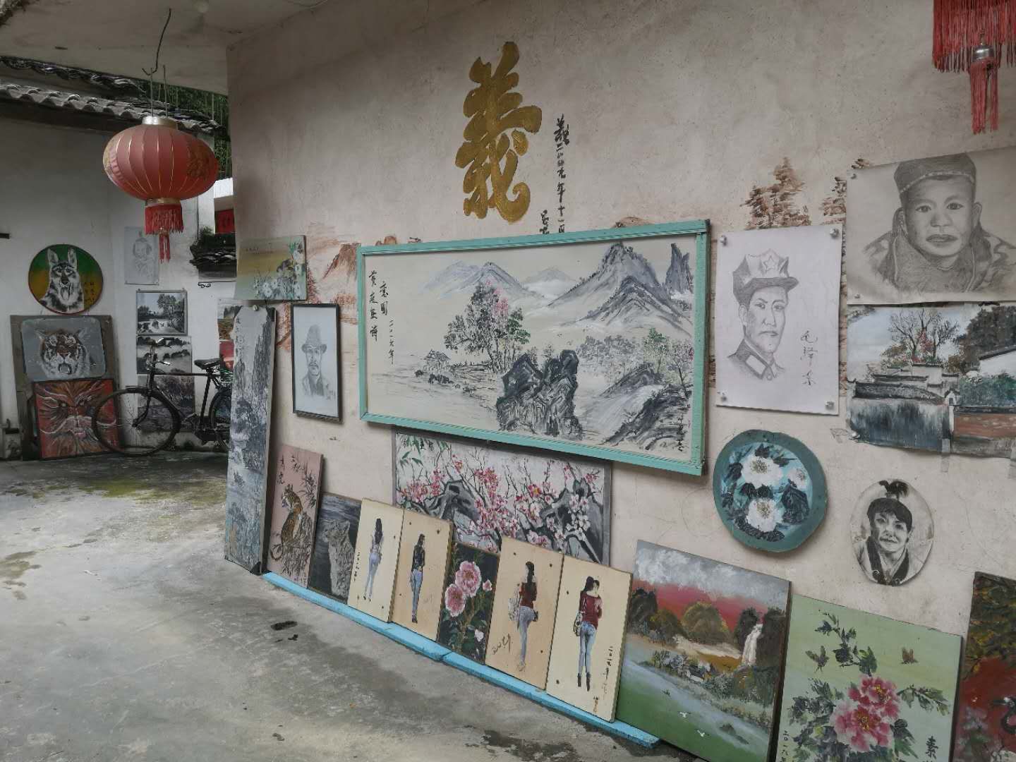 葉拾斤將自家院子改造成一個露天畫室,牆上掛滿了他的作品,人物素描栩栩如生,山水畫恢弘大氣,花鳥畫吉祥熱鬧,他以身邊的最真實的生活場景為素材,將他眼中的美麗在紙上一筆一畫的表現出來,畫出了一個農民對生活的不懈追求。閒暇時間,他還到宏村景區向前來寫生的老師和學生請教繪畫技巧和手法,不斷提高繪畫水準。
