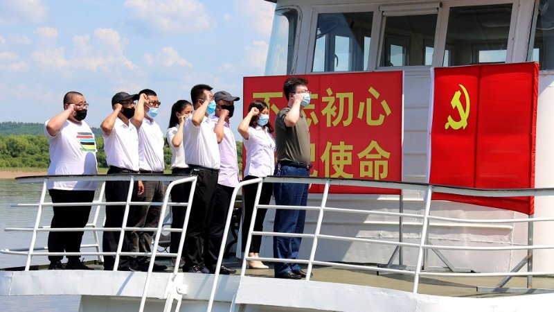 一、重溫入黨誓詞,追憶入黨初心。在黑龍江畔「長城706」工作艇上,呼瑪縣外事辦黨支部新老黨員和入黨積極分子面對黨旗,莊嚴舉起右拳,在副縣長王中尉領誓下,郎朗誦念入黨誓詞:「我志願加入共產黨,擁護黨的綱領,遵守黨的章程,履行黨員義務,執行黨的決定……」鏗鏘誓言再次震蕩現場的每一位黨員和船員的入黨初心,激勵大家砥礪前行,時刻牢記共產黨員的神聖職責,發揮好黨員的先鋒模範帶頭作用,以實際行動兌現對黨的莊嚴承諾。