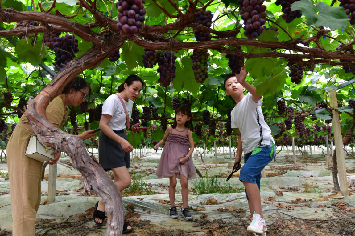 走進精華葡萄生態園,來自合肥周邊的自駕游遊客或忙於停放車輛,或一家人提着籃筐忙於採摘。而在「夏黑」葡萄大棚內放眼望去,葡萄枝架間滿是一串串熟透發紫的葡萄,園內充滿了葡萄誘人的氣息;小朋友在葡萄架下開心地觸摸葡萄、品嘗葡萄,父母則精心挑選自己滿意的葡萄,再小心翼翼地剪下放入籃中,品一顆葡萄、采一串葡萄,遊客們的臉上寫滿了愉悅之情。