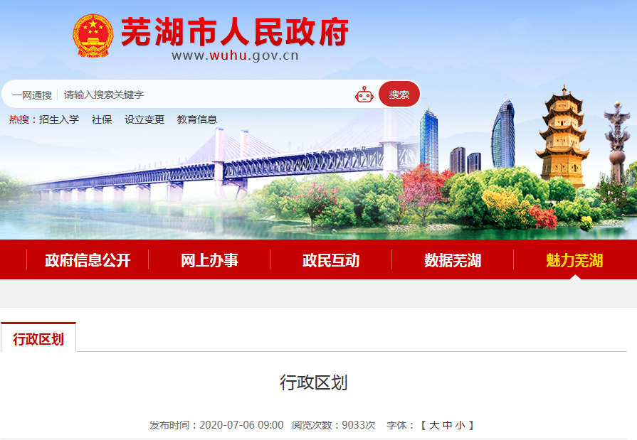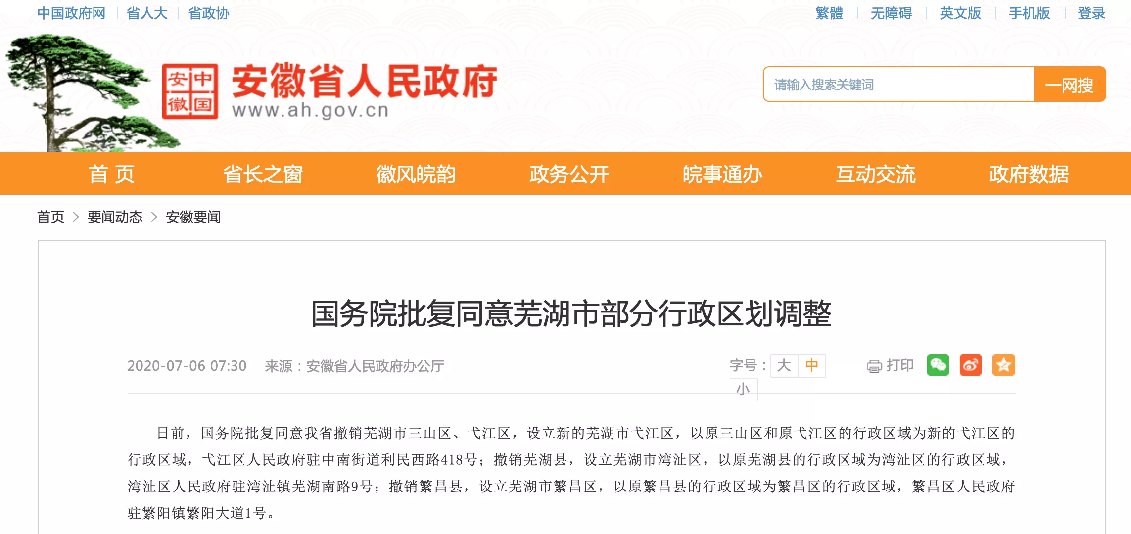 記者留意到,今日上午9時,蕪湖市人民政府官網將行政區劃內容相应予以更新。