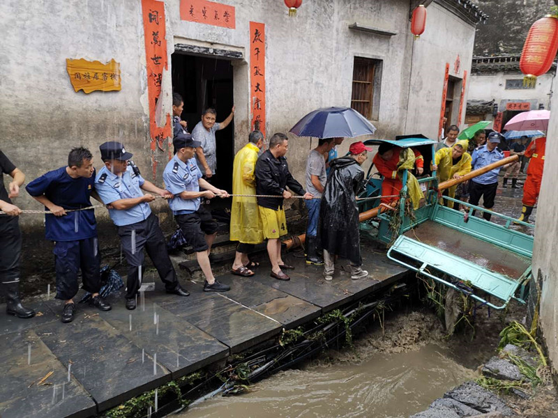 九點,巡邏的民警接警稱,強降雨造成的大水將西遞景區內一輛電瓶三輪車沖入路邊水溝,導致水流迅速上漲,平時安靜的溪水此刻變成了咆哮的猛虎,給兩側的住房安全造成了極大威脅。民警蔣先明、汪勇和西遞鎮應急消防隊員、鎮村幹部及周邊村民不顧危險,拉的拉、拽的拽,合力將三輪車拉上岸,疏通了河道,消除了險情。