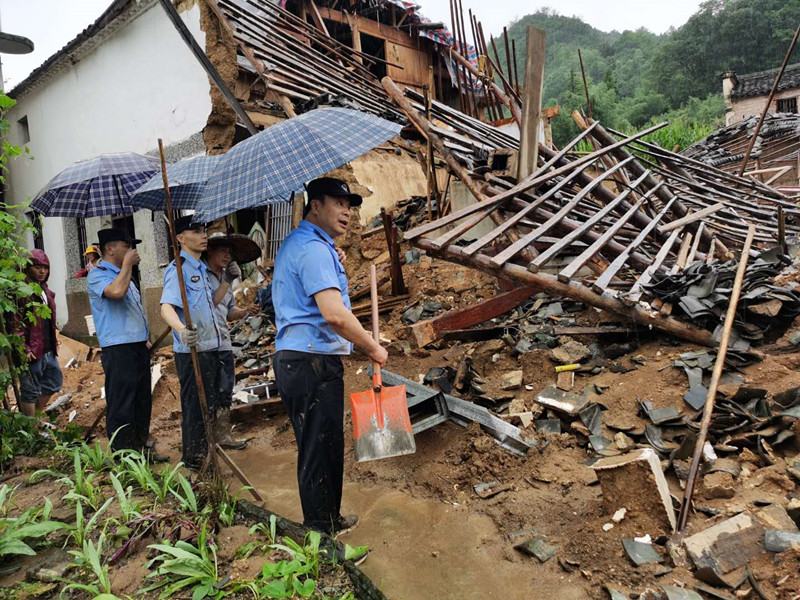 十點,民警得知西遞鎮石印村珠坑組村民房屋倒塌,民警立即趕到現場,此時,求助群眾正面對著倒塌的房子一籌莫展,不知所措。民警立刻動員人員轉移,清理倒下的殘垣斷壁,防止二次災害。當房主還想在廢墟裏翻找一些財物時,所長郭忠偉說:“這裏交給我們,替你保管,東西不會少的,請放心。”
