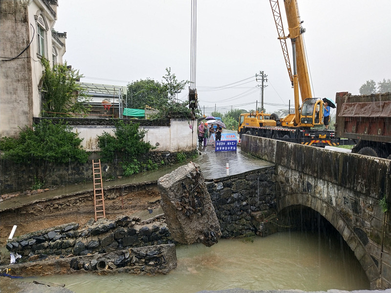 由於連日來的強降雨,西遞鎮葉村木魚溪水位暴漲,溪水一側的路基被沖毀並坍塌,原本就不寬的溪水中瞬間橫亙數條斷裂的水泥板,若不及時清理,很容易導致堵塞並漫水。