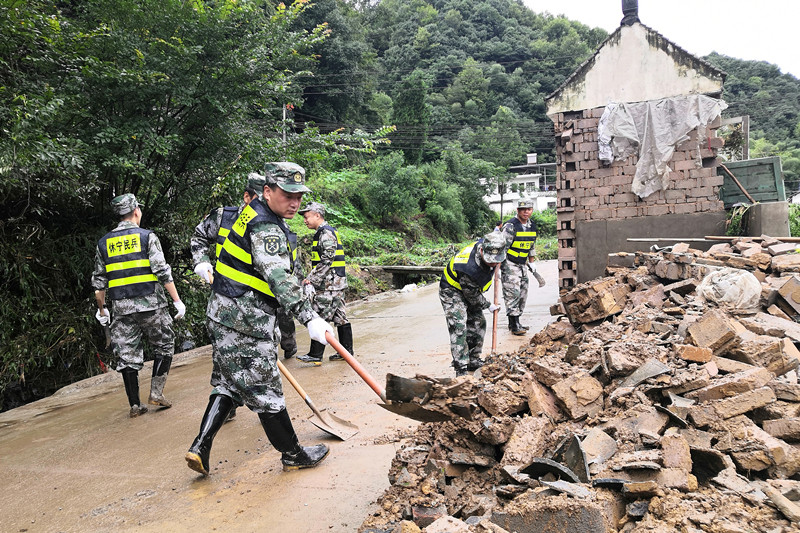 【香港商報網訊】7月9日,記者在安徽休寧縣藍田鎮前川村看到,身穿迷彩服的應急小分隊民兵有的在清除道路上的淤泥,有的在幫助村民清理倒塌的房屋,村民們也忙著清運自家洪水過後留下的淤泥,沖洗傢俱,他們相互幫忙,抗災自救。