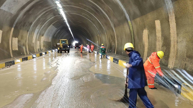 水東處塌方當日上午11時30分車輛間隔放行,到下午18時看到被塌方阻公路全部打通了。大家終於松了口氣,還沒等大家休息,晚上21時30分,興嶺隧道出口發生泥石流的險情電話隨即而到,大家立即到達現場。