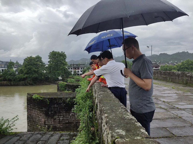 實地督導,確保安全。7月7日早,該局主要領導即帶隊赴齊雲山等重點景區、重點文旅企業及聯繫鎮村指導抗洪救災工作,要求各景區重點做好遊客安全等應急處置措施,設立專門預警員並確保24小時在崗監測。安排人員赴全縣重點文保單位特別是夾溪橋、水南橋、拱北橋等古橋實地巡查,確保安全度汛。連日來,局主要領導多次赴登封橋實地查看受水現狀,指導排除隱患。縣農村廣電傳輸中心安排人員24 小時在崗值班,確保全縣應急廣播系統正常運行並做好相關服務,指導各鄉鎮利用應急廣播及時向村民發佈預警資訊,確保人民群眾生命財產安全。7月6日以來,局駐村幫扶隊員始終堅持在抗洪搶險一線,遍訪全村29戶貧困戶,上門了解災情,幫助貧困戶做好搶險自救工作。
