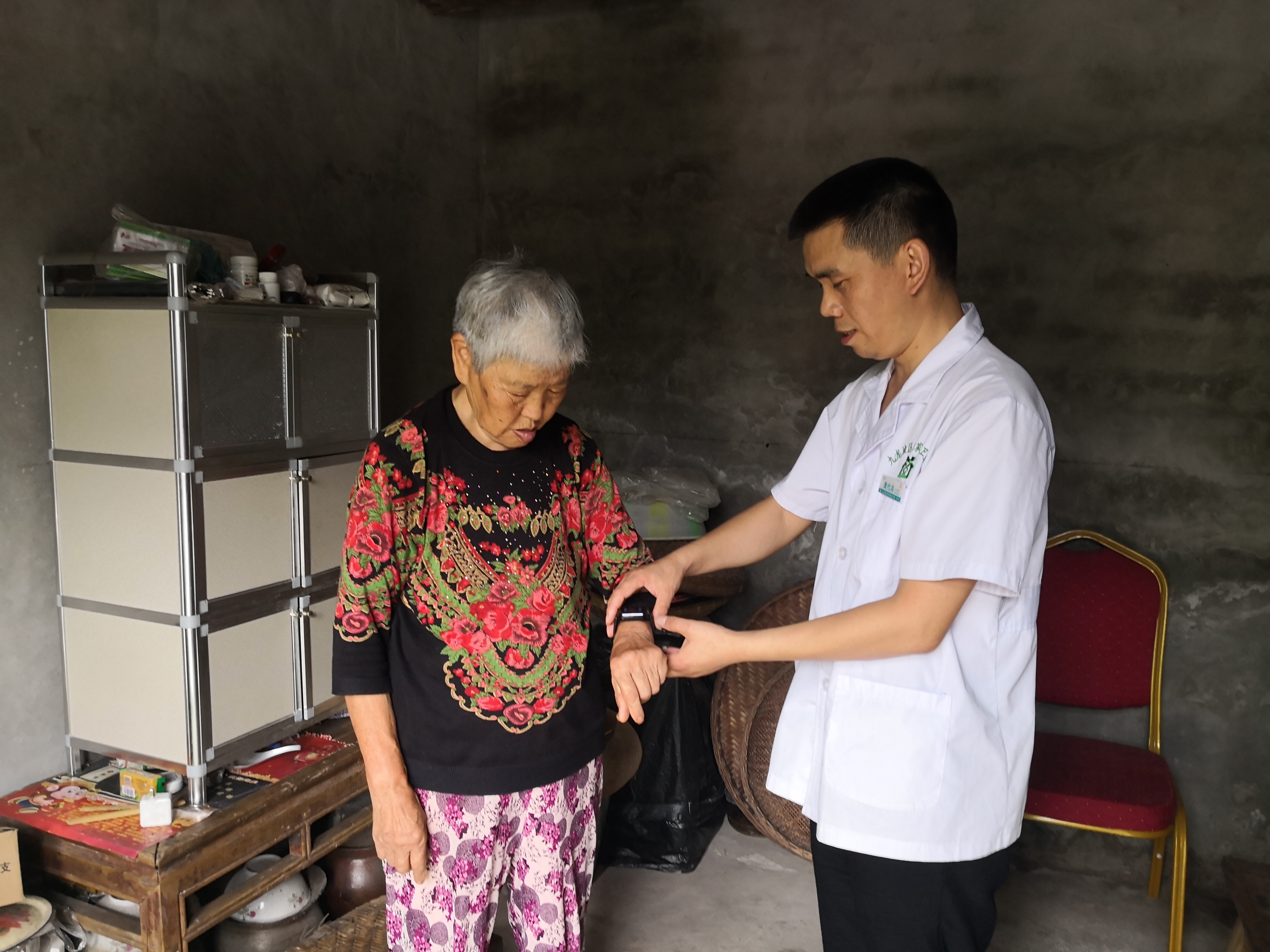 除了為行動不便的村民提供「上門服務」,「背篼醫生」還在九龍村設立了1個「背篼醫生」工作室九龍分社,方便可行動的村民自主享受免費的公共衛生服務。在「背篼醫生」工作室九龍村分社里,記者看到了擺放整齊的血壓測試儀、體重秤、心電儀等基本醫療設備。