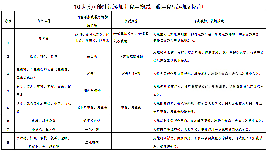 附:10大类可能违法添加非食用物质、滥用食品添加剂名单