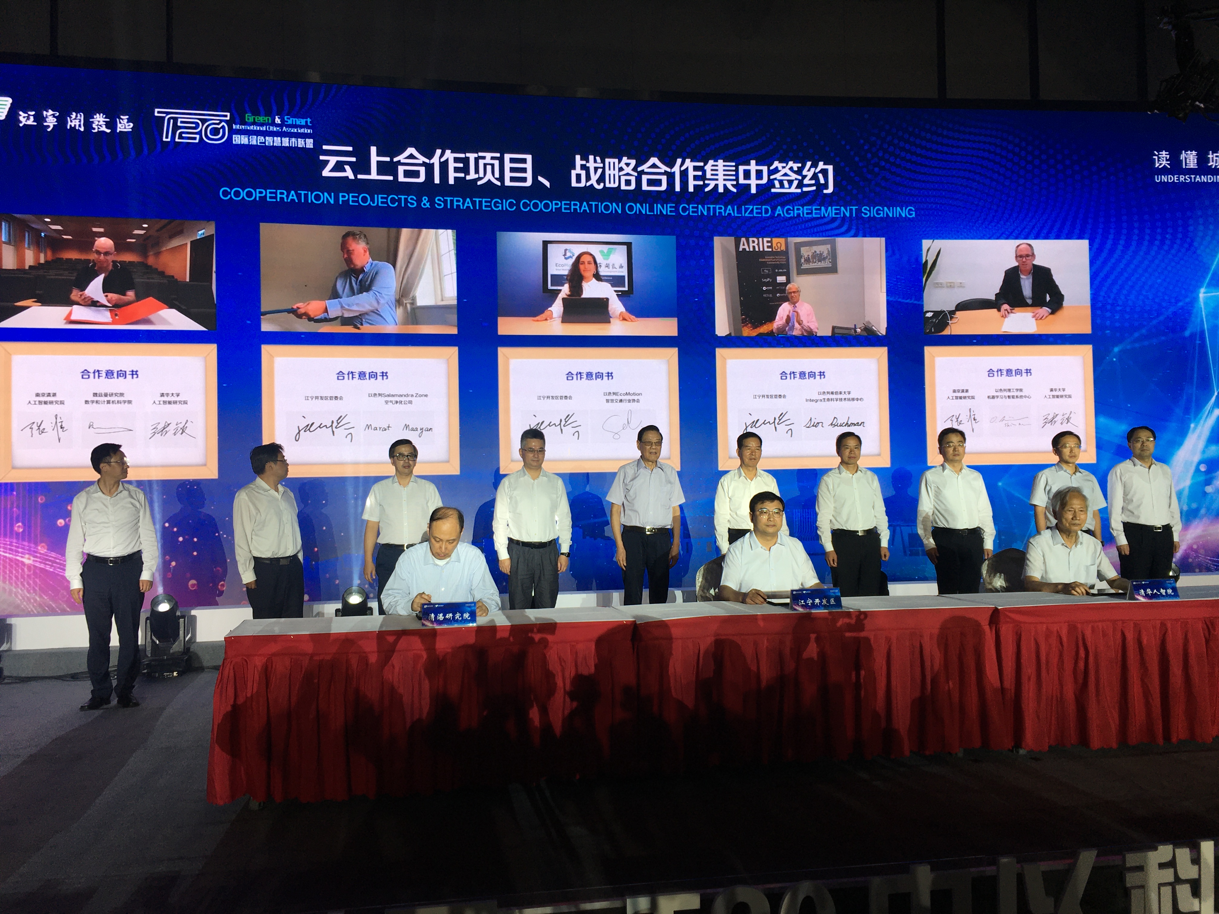 當天,江寧開發區—以色列EcoMotion智慧交通行業協會合作項目等3個項目進行雲上集中籤約;南京清湛人工智能研究院、清華大學人工智能研究院與以色列理工學院機器學習與智能系統中心、魏茲曼研究院數學與計算機科學院進行雲上戰略合作簽約;江寧開發區—中以(南京)智慧城市創新研究院海外協同創新中心項目、以色列理工學院DRIVE加速器項目,清湛人工智能研究院與上海發那科機械人有限公司、北京創新樂知網絡技術有限公司 、智慧互通科技有限公司線下合作簽約。