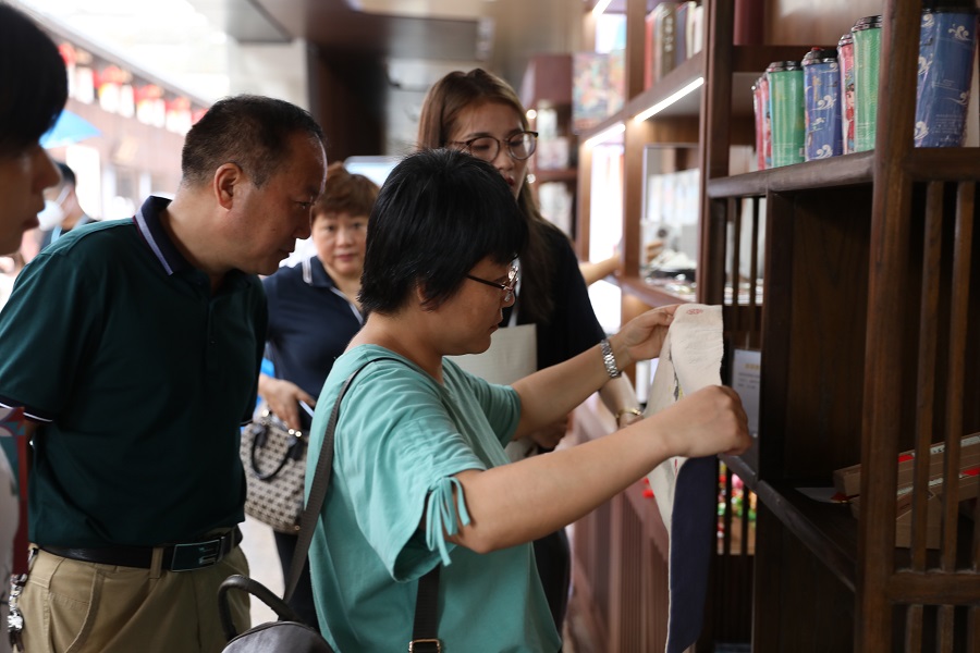 遊客在仔細鑒賞撫州文創產品宜黃夏布