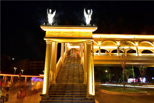 市民廣場人行天橋:古色古香的歐式裝飾風格與市民廣場相配套,夜色下橋身米黃色真石漆及暖色燈光呈現出格外溫馨、端莊的氛圍。這座人行天橋不僅是「顏值」擔當,同時「加碼」了創新路的安全指數,降低了橫穿馬路的危險性,緩解了道路的人流量,給市民帶來了出行便利。