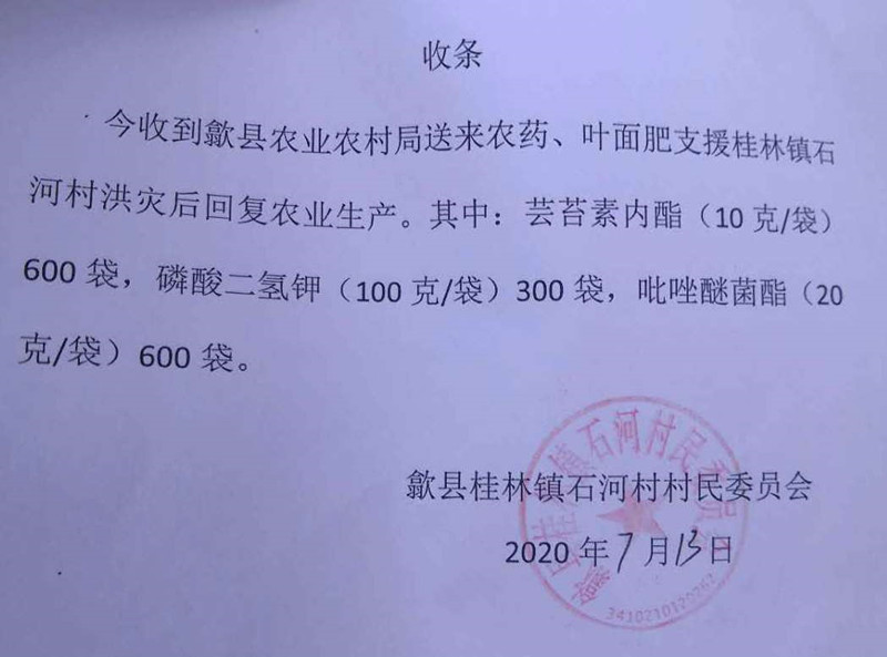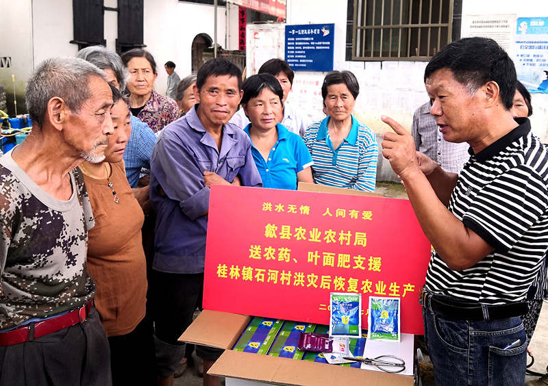 歙縣“7.7”洪災後,縣鄉農技人員深入災區,用科技幫助農民生產自救,指導災民搶種、補苗農作物,及時發放救災種子、農藥、葉面肥等農用物資,現場配藥對受淹的水蜜桃樹進行搶救性施藥施肥。