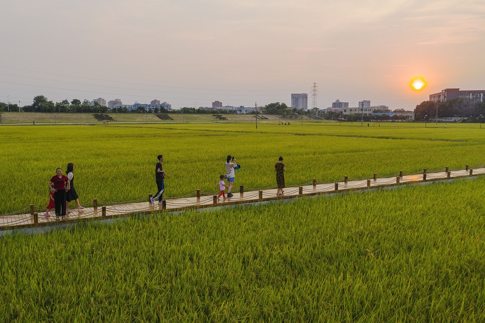 【香港商報網訊】記者 冷運軍 報導:夏日的傍晚,白天的暑氣漸漸消退,金燦燦的水稻隨風搖曳,下班後的民眾卸下工作的疲憊漫步在稻田的棧道上,天真爛漫的孩子們在田埂中嬉戲玩鬧,這樣一幅詩意的畫面近日就出現在廣東省東莞茶山的上元稻田公園。