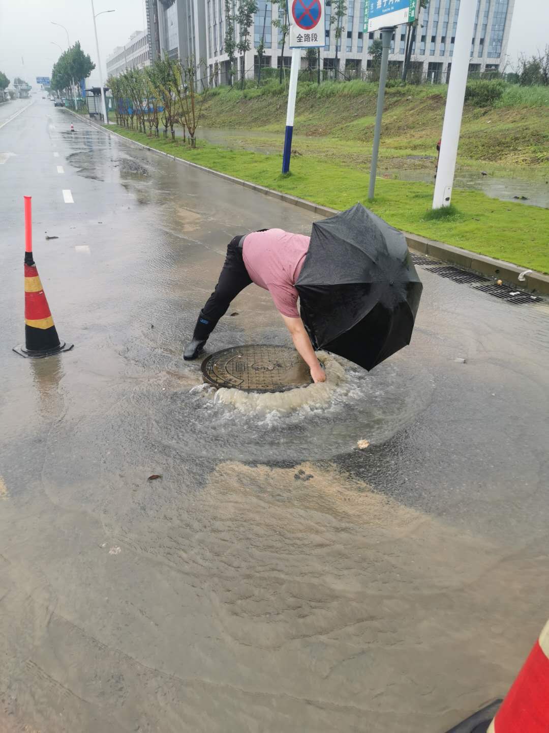 7月19日上午9點,合肥高新區雙河社區主任王軍、副書記舒桂明也參與了巡邏,在巡邏至方興大道小西河段時,發現大面積路面積水。他們立即採取行動,彎下腰拉開窨井蓋排放積水,清理下水口處聚集堵塞的垃圾。