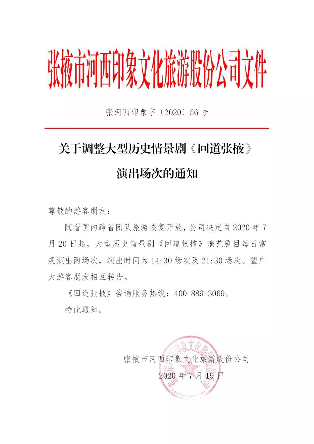 【香港商報網訊】記者 寇剛 報導:隨着國內跨省團隊旅遊恢復開放,19日,甘肅省張掖市河西印象文化旅遊股份公司出台公告顯示,自7月20日起,大型歷史情景劇《回道張掖》演藝劇目將恢復常態化演出,每日常規演出兩場次,演出時間為14:30場次及21:30場次。