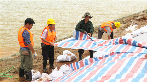 王小龍(右二)在大堤上鋪墊防水彩布 陶貴攝
