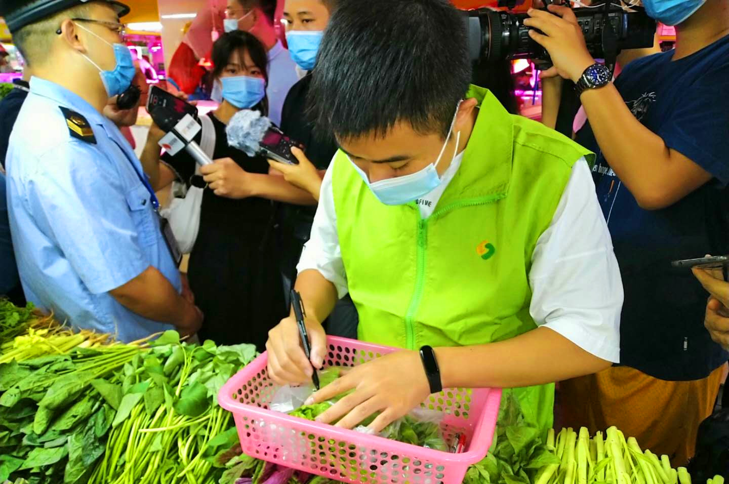 「隨機抽檢,麻煩協助配合一下……」走近一家經營葉類蔬菜的檔口,丘家軍和一名身穿「食品抽檢」背心的工作人員,隨機在菜攤上選取了長豆角、芹菜、菠菜、芥菜等4種蔬菜,並讓攤主在《食用農產品快速檢測抽樣工作單》上簽字。