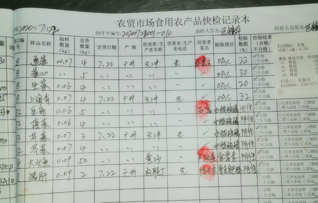 「目前國內大量蔬菜種植以小散戶為主,一些種養殖戶規範用藥的意識還不是很強,未達到間隔期就採摘上市,這樣可能會導致農藥殘留超標。」據丘家軍介紹,從黃埔區35個農貿肉菜市場整體來看,暫未在農貿市場發現使用非法添加物和濫用食品添加劑的情況。為嚴把食用農產品質量市場准入關,確保產品來源合法,市場監管部門利用不定期監督抽檢、天天快檢等技術手段,及時篩查發現不合格食用農產品並在市場公示快檢信息,依法依規處置不合格食用農產品,切實保障食用農產品的質量安全。
