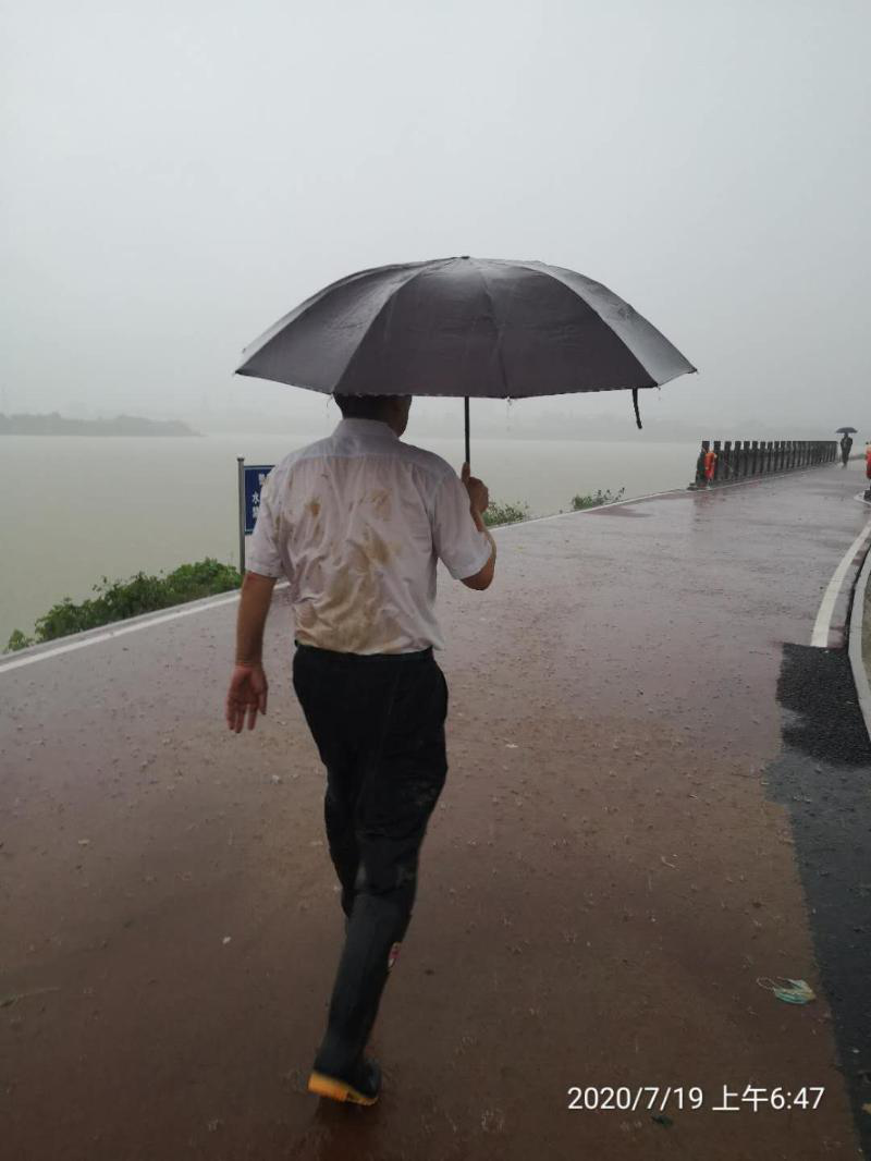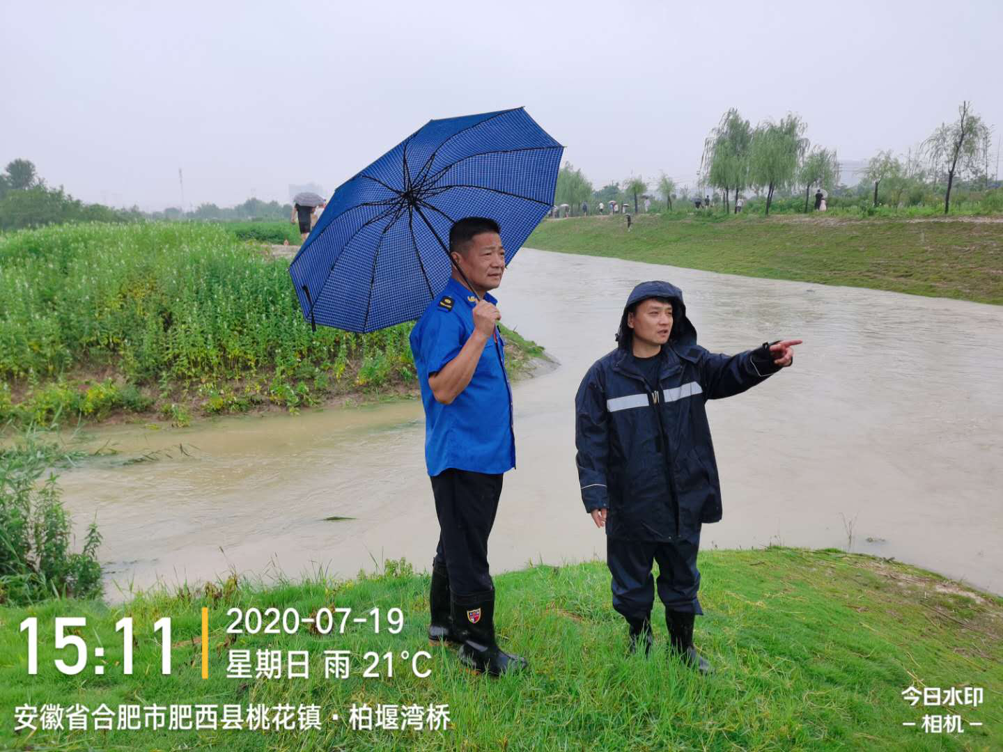 7月19日下午,唐浩東、張大武冒雨巡查柏堰湖