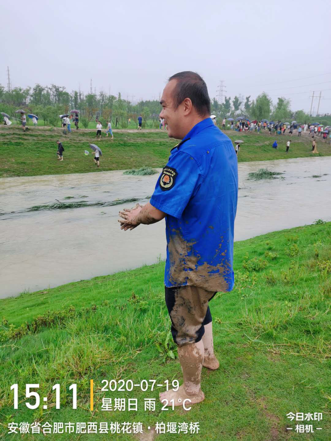 7月19日早晨,行走在大堤上的城管隊長許忠貴滿身泥漿