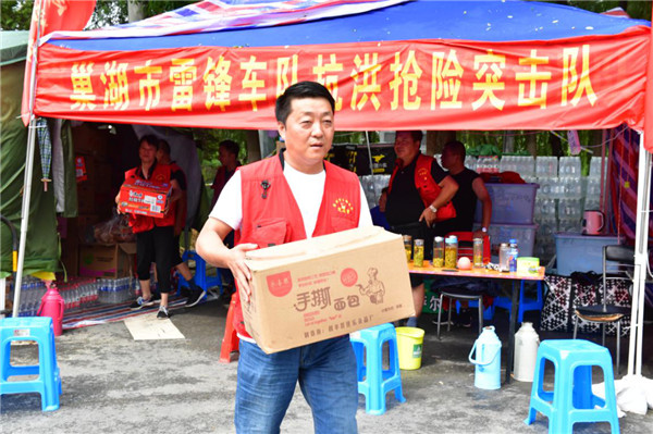 中國好人、安徽省合肥市道德模範、巢湖市雷鋒車隊隊長劉海正在協助運送防汛物資